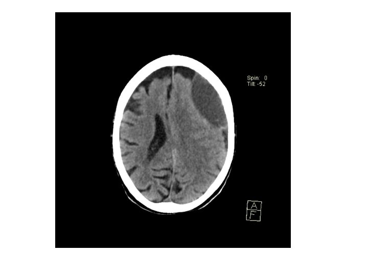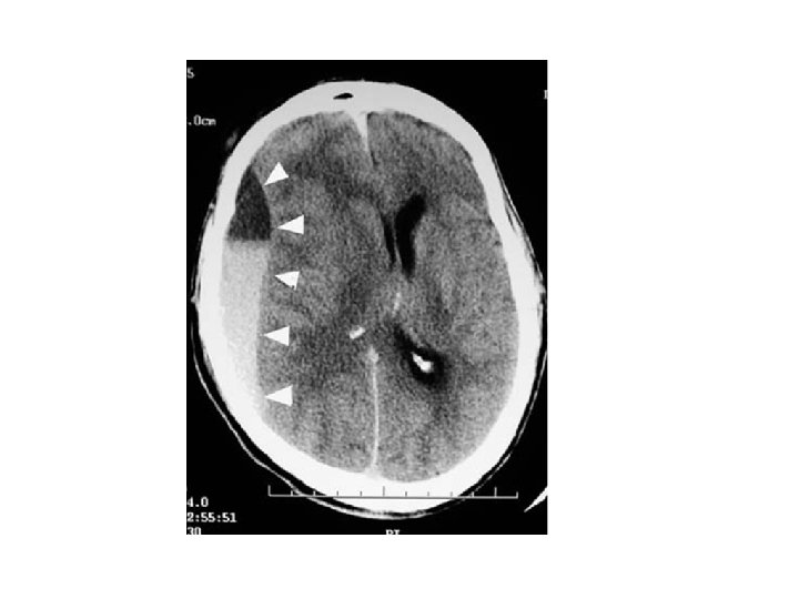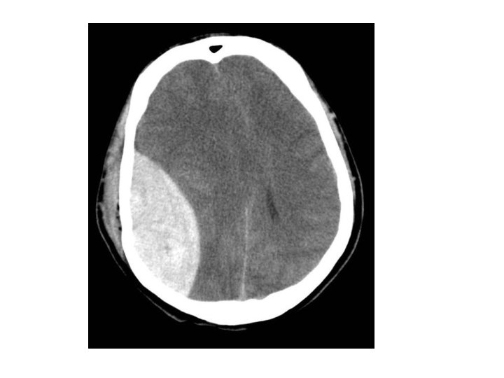 Acute Subdural haematoma • • • Crescentic hyperdense lesion Effacement of the lateral ventricle Midline shift Damage to bridging veins T