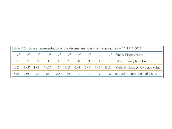 Place Value in a Binary Number • 1010 in binary: – (1 × 8) + (0 × 4) + (1 × 2) + (0 × 1)