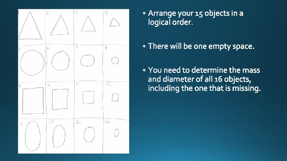 This is how your paper should look. You will take out the objects in your bag. You have 15 objects. What is missing from your set?