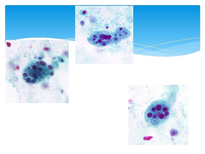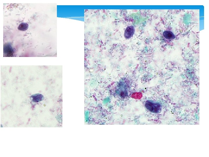 This was a case of amebiasis caused by Entamoeba histolytica. Morphologic features shown included: · trophozoites showing ingested red blood cells. · nuclei showing evenly distributed peripheral chromatin and a centrally-located karyosome. · some trophozoites showing progressive pseudopods. If ingested red blood cells are observed, a species-level identification of E. histolytica may be given. Specimens presenting with these morphologic features, but without ingested RBCs, should be reported as E. histolytica/dispar and further testing such as PCR should be performed.