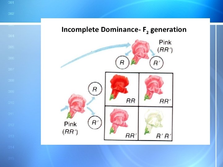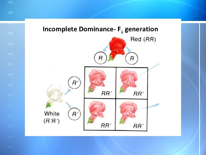 Incomplete Dominance Example 2 • In carnations, red is incompletely dominant over white. • Blended inheritance results in pink flowers. • • • RR RR BB RW WW 9/12/2021