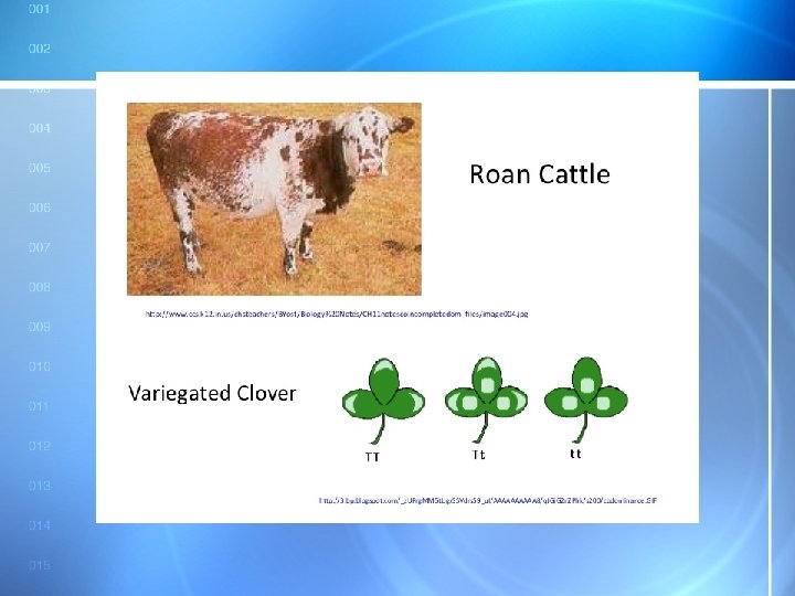 Variation #2: Codominance • A condition in which both alleles are expressed equally because they have equal dominance • The two alleles don’t blend but are present and can be seen in full form at the same time in the offspring • Ex. Checkered chickens, variegated clover, roan horses and cows 9/12/2021
