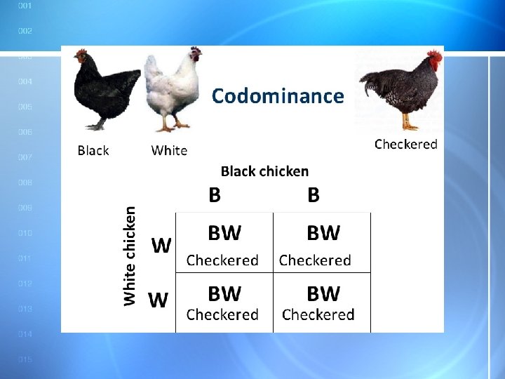 Example 3: Codominance • In cattle brown B is codominant over white W. 9/12/2021 – BB – WW – BW