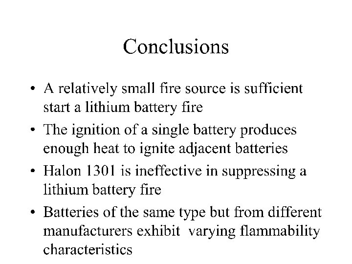Current Work • Lithium-ion rechargeable batteries – Literature search on battery types – Evaluation of existing flammability data – Effect of charge state on flammability – In house testing as required – Coordination of efforts with the Lithium Battery Technical/Safety Group