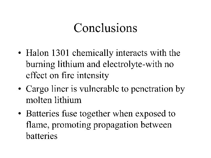 CONCLUSIONS • The temperatures found in a suppressed smoldering cargo fire are sufficient to ignite a primary lithium battery • The pressure rise due to battery ignition is sufficient to compromise the integrity of a cargo compartment