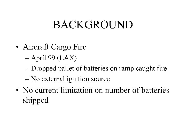 Review of Previous Tests • Primary battery failure mode • Ignition intensity – Effect of fire size • Battery flammability by type and brand – CR 2, PL 123 A, Duracell, Panasonic • Effect of packing material • Cargo liner integrity