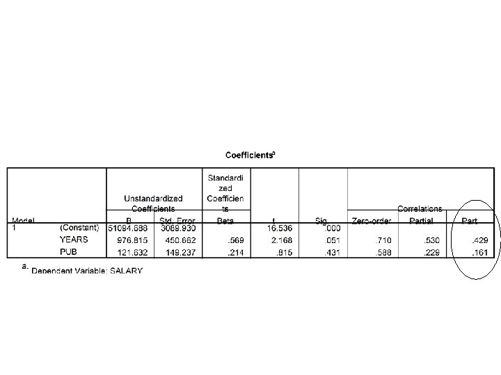 R 2 =. 53 or a + b + c r 2 SY =. 50 or b + c r 2 SP =. 35 or a + c e So what is just “a”? Salary a b c Publications Years