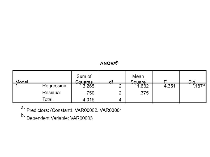 Multiple R • If F > Fcrit reject Ho and accept H 1 • If F < or = Fcrit fail to reject Ho • Current problem – fail to reject Ho – These two variables do not predict the outcome