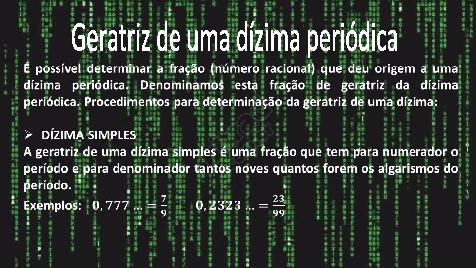 Números formados por infinitos algarismos que se repetem periodicamente. E o número que se repete é chamado de período. Exemplos: 2, 333. . . 0, 121212. . . 0, 4333. . . 2, 5222. . . Na dízima 2, 333. . . o período 3 posiciona-se logo após a vírgula. Na dízima 0, 121212. . . o período 12 posiciona-se logo após a vírgula.
