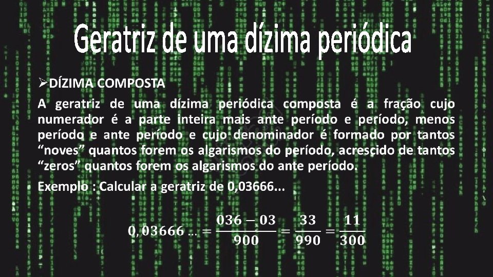 O número decimal 0, 3222. . . é uma dízima periódica composta, uma vez que entre o período e a vírgula existe uma parte não-periódica. Nessa dízima, o número 3, situado entre a vírgula e o período, corresponde à parte não-periódica. Outros exemplos: 2, 4333. . . 0, 12555. . . 0, 43777. . .