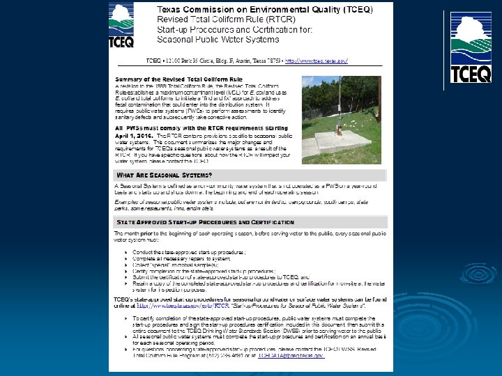 Seasonal System Start Up Seasonal System: A NCWS that starts-up and shuts down during the year Seasonal Systems must: • Complete all TCEQ required seasonal system start-up procedures prior to serving water to customers • (including a “special” sample).