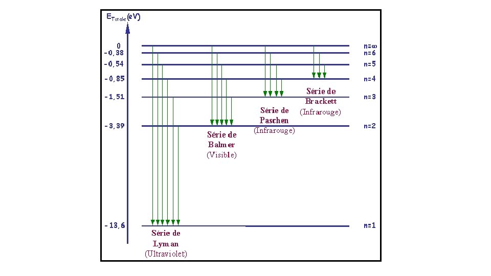 Exercice 2 Calculer les longueurs d'onde des raies visibles observées sur le spectre d’émission de l’Hydrogène. On prendra les 4 raies de Lyman. Donner la variation d'énergie de l'atome d'hydrogène liée à l'émission de la première raie et de la raie limite dans la série de Lyman. On dit que le spectre d'émission de l'atome d'Hydrogène se décompose en plusieurs séries: les séries de Lyman, Balmer, Paschen, Brackett et Pfund. Chaque série est définie par le niveau d'énergie final des transitions électroniques. .