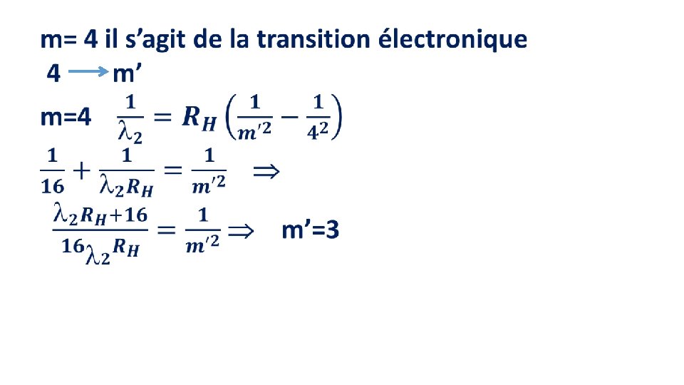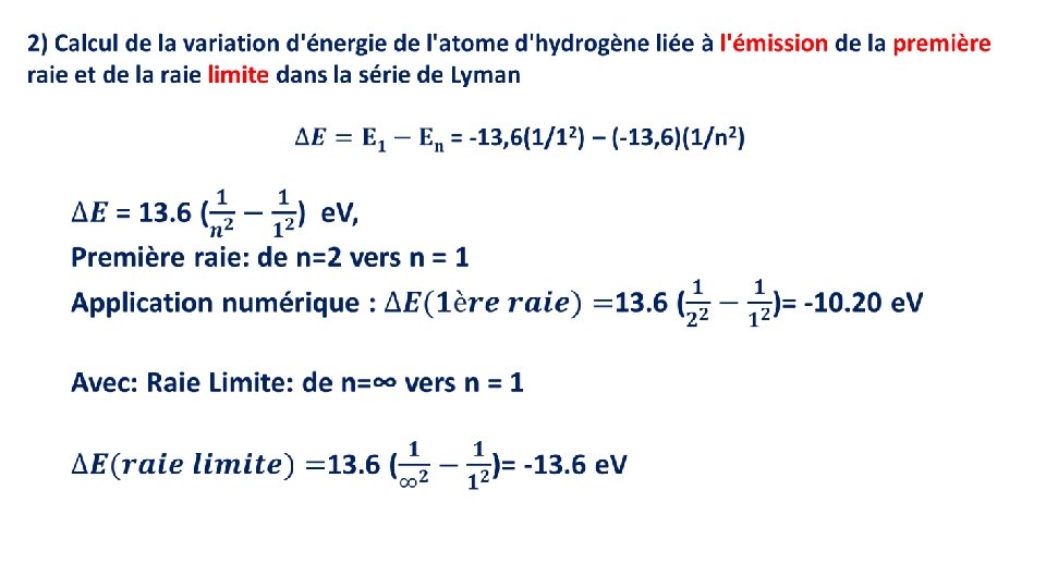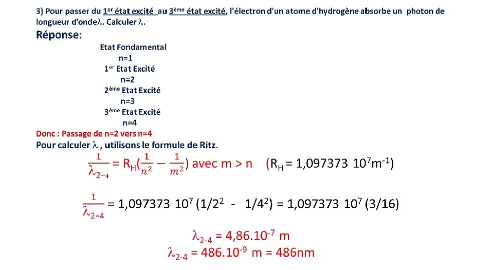 Pour l’hydrogénoïde de l’atome de 4 Be, calcul du photon d’énergie associé à la transition : état fondamental - 2ème état excité: L’hydrogénoïde est Be 3+ Il s’agit de la transition: n=1 n=3 E 1 -3 = E 3 – E 1 absorption donc E 1 -3 > 0 E 3 = -13, 6 Z 2/n 2 = -13, 6 (4)2/32 = - 24, 18 e. V E 1= -13, 6 Z 2/n 2 = -13, 6 (4)2/12 = - 217, 6 e. V E 1 -3 = E 3 – E 1 = 193, 42 e. V (1 e. V= 1, 602. 10 -19 j) E 1 -3 = 3, 099. 10 -17 J