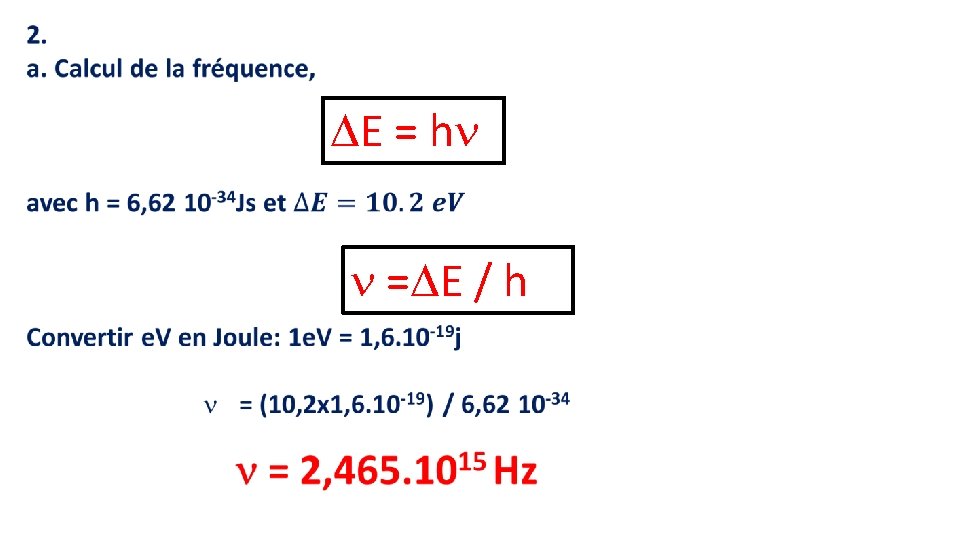 Calcul de la fréquence : E =h = E / h = 302, 2 x 1, 6. 10 -19/6, 62 10 -34 J s =7, 304. 1016 s-1= 730, 4. 1014 s-1 Calcul de la longueur d’onde =c/ =3. 108/730, 4. 1014 = 4, 11. 10 -9 m