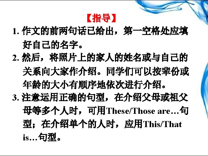 photo 7. picture (同义词) ______ daughter 8. son (对应词) _______ Here is/are… 9. 这就是……。___________ 10. 我的两张家庭照片 ____________ two photos of my family in the first /next photo 11. 在第一/下张照片中 _________ 12. 狗的名字 __________ the name of the dog