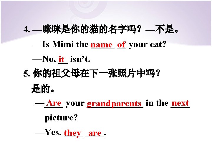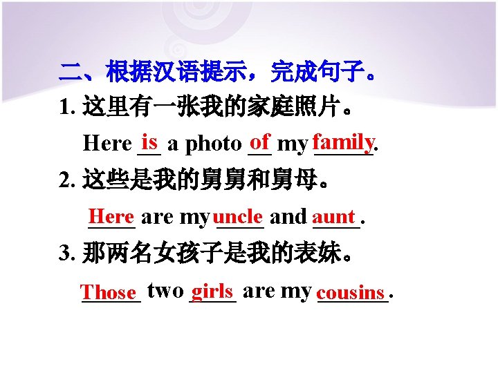 2. Complete the conversation. Bill: Here’s a photo of my family. Who’s he? Dale: ____ He’s my uncle. Bill: ____ Dale: Who’s ______ this girl? Bill: She’s _____ my cousin. Dale: Are ____ they your parents? they are. And these are Bill: Yes, ____ my grandparents.
