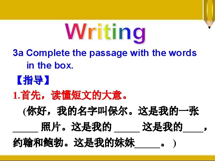 一、根据首字母及图片提示,写出单词。 1. Look! This a p_____ icture/hoto of my brothers. unt Mary. 2. This is my a___, ister She’s my father’s s____.