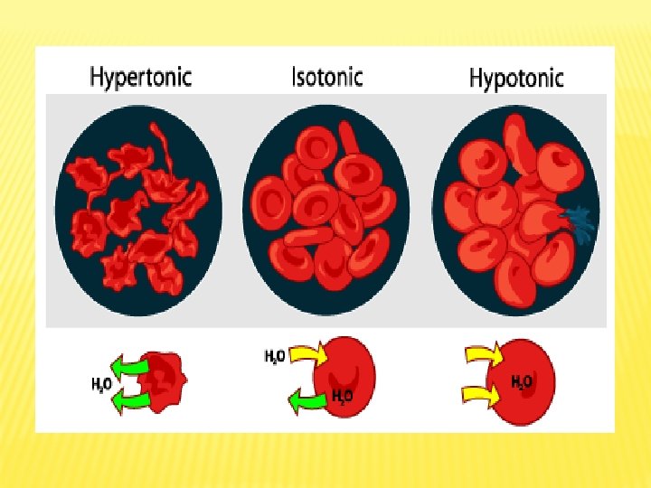 No Exp. Steps Observation Conclusion Cleanse a finger with alcohol swab. With a sterile lancet, make a puncture on a fingertip. Apply 3 drop of blood on 3 clean glass slides and make smear: 3 1 st slide is a Demonstratio “control”, examine n of Effect of RBCs under Extracellular microscope. Solution on Red Blood Cells (RBCs) 2 nd slide: mix blood with drops of distilled water, examine under microscope. 3 rd slide: mix blood with drops of 5% In control, normal RBCs shape and size because they are in normal isotonic RBCs that are mixed with distilled water swollen (increase volum), RBCs in Na. Cl solution shrunk (decrease volume). the rate of water entry into the cell equals the rate of exit. the rate of water entry into cell is higher than water exit, the rate of water exit from the cell is higher than