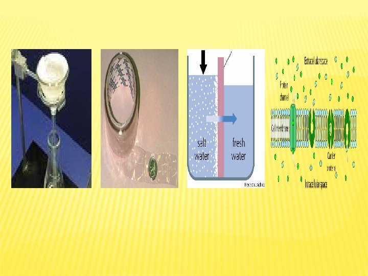 Types of Membranes Permeable Allows solutes particles to permeate Semi-permeable Selective permeability Does not allow either solute or Permeate solvent (water) particles to molecules only. permeate. Allows solvent molecules to permeate and some solute molecules Impermeable filter paper Nylon Cell wall in plant Tin cells cellophane Cell membranes
