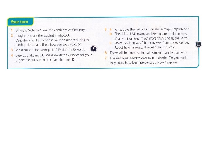 Activity 4 a) At A, since it is nearer the epicentre. b) At B, since buildings can collapse and kill people. c) A lot more damage, since it releases a lot more energy. d) 30 times. e) At 5 am, since people will be asleep. By 10. 30 am, many will have left for work and home. That does not mean they are out of danger. But they will have more chance to protect themselves if they are awake, for example by moving away from windows, and following the emergency earthquake drill.