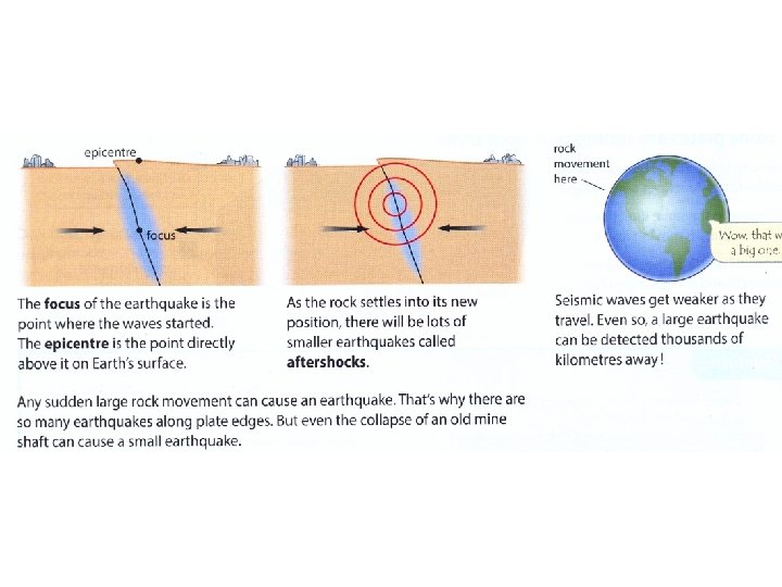Activity 2 a) Seismic waves are waves of energy given out during an earthquake; they pass through Earth in all directions and cause everything to shake. b) The focus of an earthquake is the point where the rock moved, setting the earthquake off. c) The epicentre of an earthquake is the point on Earth’s surface directly above the focus. d) The magnitude of an earthquake means how much energy it gives out; it is measured on the Richter scale.