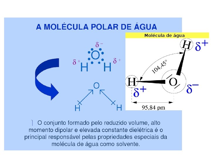 A molécula é altamente polar, podendo induzir polaridade nas moléculas vizinhas. Cada molécula de água tende a atrair 4 moléculas próximas, formando um agregado de massa 5 vezes maior. As moléculas de água ficam unidas entre si por fracas forças eletrostáticas, as ligações de hidrogênio, cujo valor energético é de apenas 4, 5 kcal, comparado com 110 kcal para as ligações covalentes.