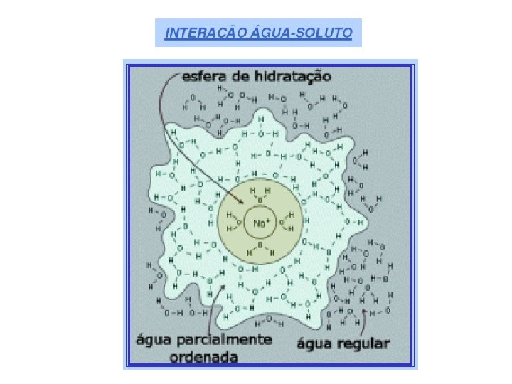 O sólido iônico, ao se dissolver em água, se quebra em pequenas unidades: cátions (íons de carga positiva) e ânios (íons de carga negativa). A equação química é a forma com que o processo é representado; no exemplo, a dissolução do cloreto de sódio (sal de cozinha) em água. NA HIDRATAÇÃO Na. Cl (s) Na + (aq) e Cl- (aq). O número de moléculas de água imediatamente próximas depende do tamanho e carga do cátion.
