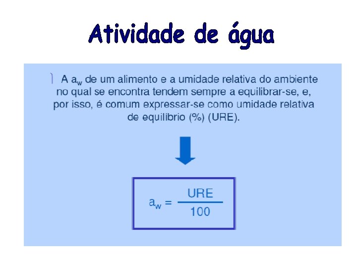 aw - Indica a intensidade das forças que unem a água com outros componentes não-aquosos e, consequentemente, a água disponível para o crescimento de microorganismos e para que se possam realizar diferentes reações químicas e bioquímicas.
