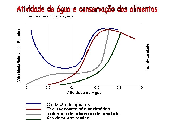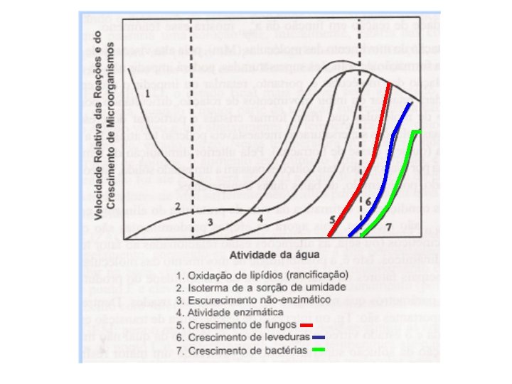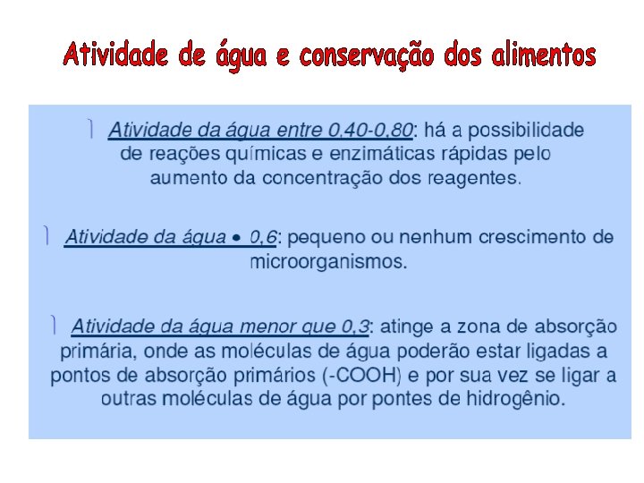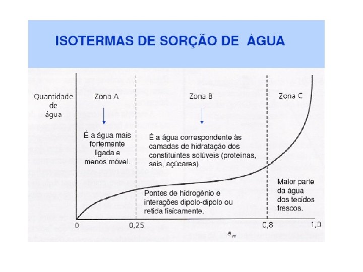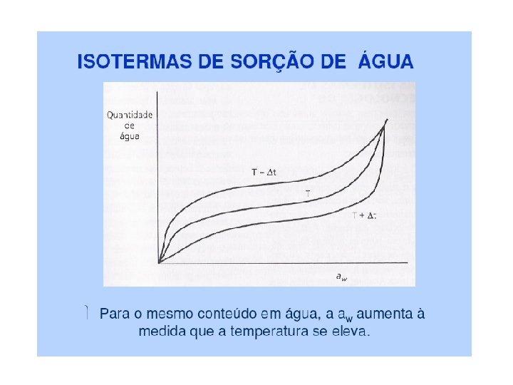 • Diferenças na intensidade com que a água se associa com os constituintes não aquosos. • A água envolvida em associações mais fortes é menos suscetível ou propensa para as atividades de degradação (crescimento de microorganismos e reações químicas de hidrólise).