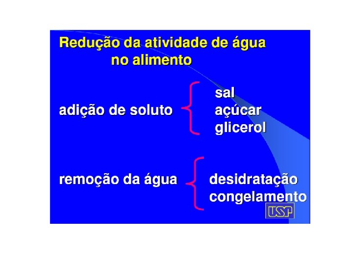 Atividade de água de alguns alimentos e suscetibilidade à deterioração Microorganismos capazes de Faixa de Aa se desenvolver Alimentos com Aa na faixa indicada 1, 00 – 0, 95 Pseudomonas, Escherichia, Proteus, Shigella, Klebsiella, Bacillus, Clostridium perfringers e algumas leveduras. Alimentos muito perecíveis (frutas frescas, vegetais, carnes, peixe), lingüiças, salsichas e pães cozidos, alimentos contendo até 40% de sacarose e 7% de sal. 0, 95 – 0, 91 Salmonella, V. parahaemolyticus, C. Botulinum, Serratia, Lactobacillus, Pediococcus, alguns fungos, Rhodotorula, Pichia. Alguns queijos (cheddar, suíço, provolone), carnes curadas (presunto), concentrado de frutas, alimentos contendo até 55% de sacarose ou 12% de sal. 0, 91 – 0, 87 Muitas leveduras (Candida, Torulopsis, Hansenula), Micrococus. Embutidos fermentados (salames), bolos confeitados, queijos desidratados, margarina, alimentos contendo até 65% de sacarose ou 15% de sal. 0, 87 – 0, 80 A maioria dos fungos, Staphylococcus aureus, a maioria das Saccharomyces spp. , Debaryomyces. Concentrados de frutas, leite condensado, xaropes de chocolate e frutas, farinha, arroz, granulados contendo 15 a 17% de umidade, bolos de frutas, presuntos caseiros, foundies e confeitos açucarados. 0, 80 – 0, 75 A maioria das bactérias halófilas. Geléias, marmeladas, marzipã, glacê de frutas e marshmallow. 0, 75 – 0, 65 Fungos xerofílicos (Aspergillus chevalieri, A. candidus, Wallemia sebi), Saccharomyces bisporus. Flocos de aveia contendo 10% de umidade, cremes para recheio, geléias, marshmallow, melaço, caldo de cana de açúcar, algumas frutas secas e castanhas. 0, 65 – 0, 60 Leveduras osmofílicas (Saccharomyces rouxii), poucos fungos (Aspergillus echinulatus, Monascus, Monascus bisporus). Frutas secas contendo de 15 a 20% de umidade: algumas balas, caramelos e mel. 0, 50 Sem proliferação microbiana. Macarrão e massa similares, contendo 12% de umidade, temperos com 10% de umidade. 0, 40 Sem proliferação microbiana. Ovo em pó com 5% de umidade. 0, 30 Sem proliferação microbiana. Biscoitos e torradas com 3 -5% de umidade. 0, 20 Sem proliferação microbiana. Leite em pó (2 – 3% umidade), vegetais desidratados (5% umidade), flocos de milho (5% umidade), sopas desidratadas