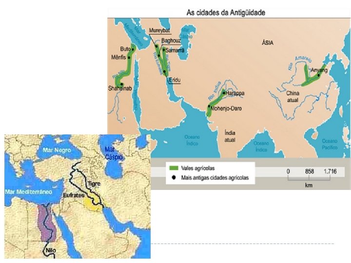 Revisão para a Prova O surgimento das cidades As primeiras cidades surgiram onde? Nas proximidades de grandes rios, onde se iniciou a atividade agrícola. A união das pequenas aldeias provocou a formação das primeiras cidades que ficaram conhecidas como civilizações fluviais, pois ficavam em torno de importantes rios como: Rio Nilo, cidades egípcias; Rios Tigres e Eufrates, cidades mesopotâmicas (entre rios); Rios Hoang-Ho e Yang-Tsé, cidades chinesas; Rio Indo, cidades harapenses.