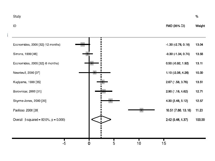 Heterogeneidade metodológica e estatística § Os desenhos de estudo são diferentes § Heterogeneidade estatística. Variação entre os resultados estudos é maior do que a esperada ao acaso. § Intervalos de confiança de alguns estudos não englobam os riscos relativos observados por outros estudos