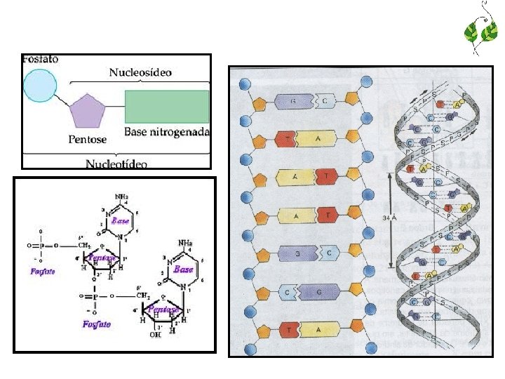 • RNA: processo de síntese das proteínas (fita simples) • DNA e RNA são formados por vários nucleotídeos • Nucleotídeo: – Fosfato; – Açúcar (DNA=desoxiribose e RNA=ribose); – Base nitrogenada