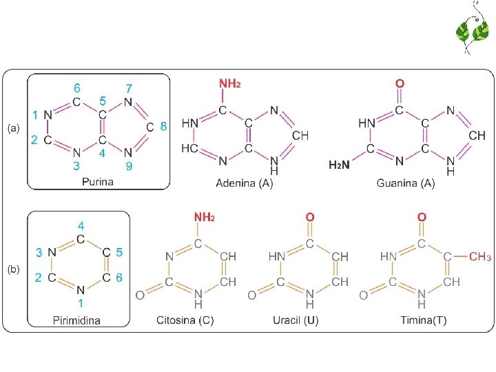 • Bases nitrogenadas – Púrica (duas cadeias fechadas): adenina e guanina – Pirimídica (uma cadeia fechada com quatro átomos de carbono e dois de nitrogênio): timina, citosina e uracila DNA RNA Adenina (A) Bases púricas Guanina (G) Citosina (C) Timina (T) Uracila (U) Bases pirimídicas Açúcar (pentoses) Desoxiribose Ribose Questão 32