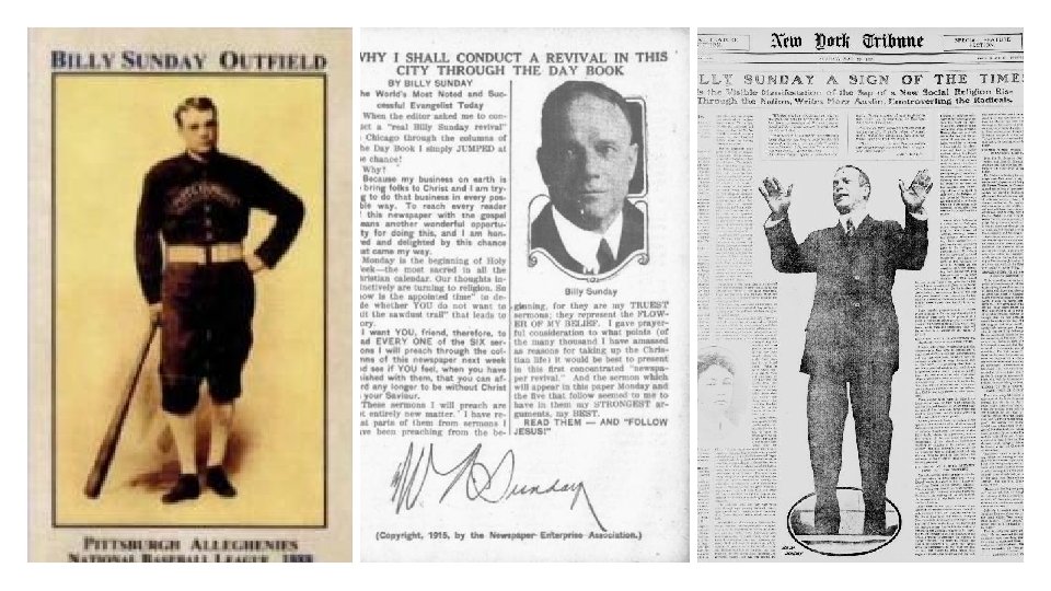 Billy Sunday (November 19, 1862 – November 6, 1935) was an American athlete who, after being popular in baseball's National League during the 1880 s, became the most celebrated influential evangelist during the first two decades of the 20 th century. He had multiple messages –when the ladies were there, he was charming and sweet. When it was men only, he talked to them like he was in the dugout with his guys. Its documented that men actually fainted, cried and even reporters said no one could repeat what he said. Who slides into home plate to illustrate a message? His tough talk lined the altars with men wanting to repent and reform their lives. For being so tough in the pulpit it is great he was a man of integrity and no scandal ever touched Sunday’s life.