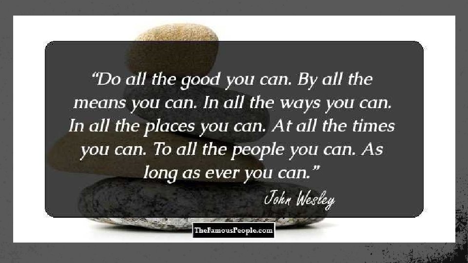 • JOHN WESLEY WAS A HIGH PULPIT PREACHER WITH FANCY WORDS AND POLISHED STYLE - WHEN HE STARTED TO PREACH THE PEOPLE STARTED TO WEPT AND CRY AS HE PREACHED. HE COMMANDED AN AUDIENCE OF THOUSANDS • IT WAS THROUGH HIS PREACHING THAT WESLEY BEGIN TO TEACH THE PEOPLE IN METHODOLOGY TEACHING AND ORGANIZATIONAL MEETINGS - WHICH LATER BECAME THE METHODIST CHURCH • THIS REVIVAL OF 1735 BROUGHT ABOUT A TRANSFORMATION OF CONDITIONS WHICH REVERSED THE SOCIAL, MORAL AND POLITICAL DECLINES. DEISM [WHICH DENIED THE NEED OF GOD] WAS STOPPED IN ITS TRACKS • An Awakening happened simultaneously in American colonies, England, Scotland Ireland. • It would cause England to avert the bloody French revolution that France was revving up for. •