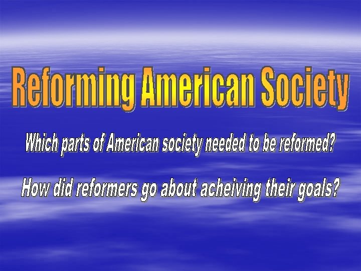 • Revivalists/Transcendentalists attempted to reform the problems of morality & personal responsibility • Reformers also attempted to fix public education & gain humane treatment for the mentally ill & prison reform • Women’s rights, and the Abolitionists movements also gained ground • Workers also started to mobilize for fair treatment from employers • Reformers organized protests/strikes, spoke out against problems, printed newspapers, drew public attention to problems to bring about reform & change