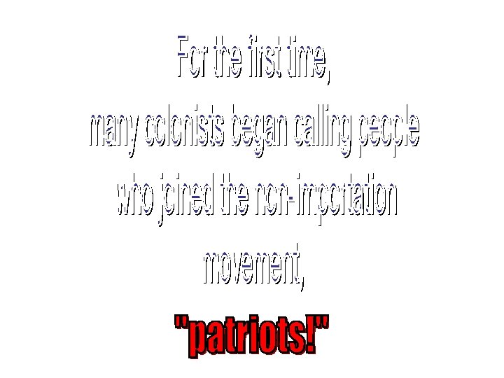 Colonial Response to the Townshend Duties 1. John Dickinson 1768 * Letters from a Farmer in Pennsylvania. 2. 1768 2 nd non-importation movement: * “Daughters of Liberty” * spinning bees 3. Riots against customs agents: * John Hancock’s ship, the Liberty. * 4000 British troops sent to Boston.