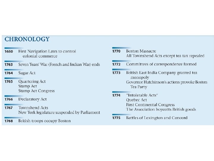 • Proclamation Line of 1763 Colonists were not allowed into the Northwest Territory • Colonists defied order— American Dream • Writs of Assistance --1763 ---unrestricted British search warrants to stop Colonial smuggling…… • Continued to smuggle • Quartering Act --1763 ---Colonists were to house and feed British soldiers. • Colonial resentment-why are soldiers here?