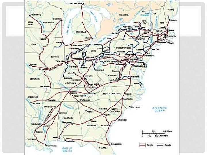 AMERICAN SYSTEM • The War of 1812 made it clear that America needed an independent economy from France and Britain • Designed by Henry Clay to unify the nation • Focused on transportation: roads, canals, eventually railroads, protective tariffs, and a new national bank • Raw materials would be shipped from the South to be manufactured in the North and then sold in the country • Made in America • National Road- first major federal highway which stretched from Maryland to Illinois • Started in 1811 and originally finished in 1818 • Became a gateway for people traveling West • Erie Canal