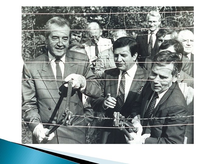 Hungary II. � March 1989: demonstrations during the National Day pushed the regimes to negotiations with non-Communist parties. � April 1989: Round Table talks. � May 1989: Hungary began dismantling its 150 mile long border fence with Austria. � June 1989: rehabilitation of Prime Minister Imre Nagy (hanged for treason; revolution in 1956). � September 1989: New constitution; call for free election.