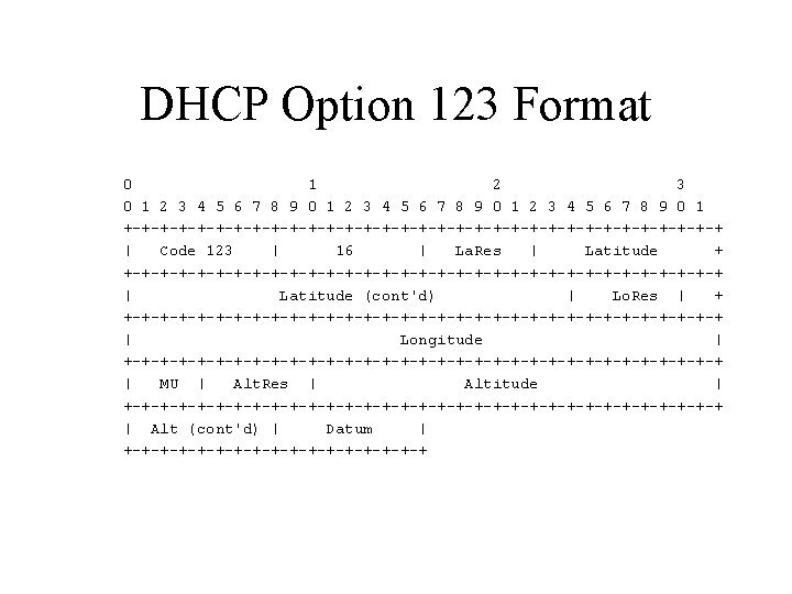 RFC 3825 Location Configuration Information DHCP Option James M. Polk John Schnizlein Marc Linsner ftp: //ftp. rfc-editor. org/in-notes/rfc 3825. txt 6 Oct 2006