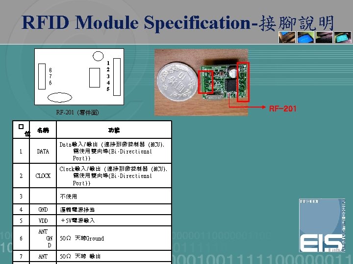 RFID Module Specification-時序圖 • 資料傳送至RF-201 DATA腳與CLOCK腳的時間單位 Low Bit High Bit Data Clock 50 us Note : 在 Low to High 時讀取資料 • 資料接收時序同上圖, 等待讀取時的Time Out (30 ms)