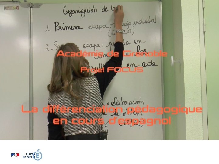 Exemple de dispositif pédagogique possible Répartition de la classe en groupes hétérogènes. Objectif: repérer, décrire, analyser. Parmi chaque groupe: v Des élèves chercheurs: recherche lexicale, culturelle pour répondre aux besoins et/ou les anticiper. v Des élèves descripteurs: décrire en phrases simples ce qu’ils voient (travail sur les plans, les formes et les couleurs…) v Des élèves analystes: interpréter, analyser et réinvestir les elements de la séquence. v Un “ambassadeur” fait la restitution du groupe concerné. →La mise en commun débouchera sur une trace écrite.