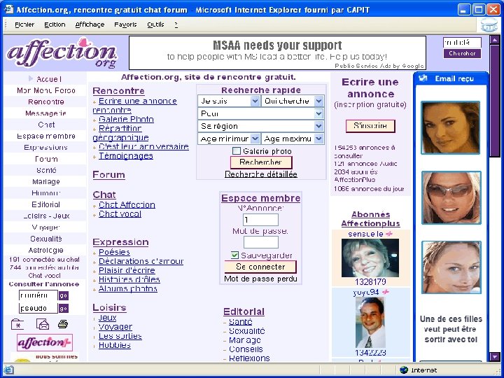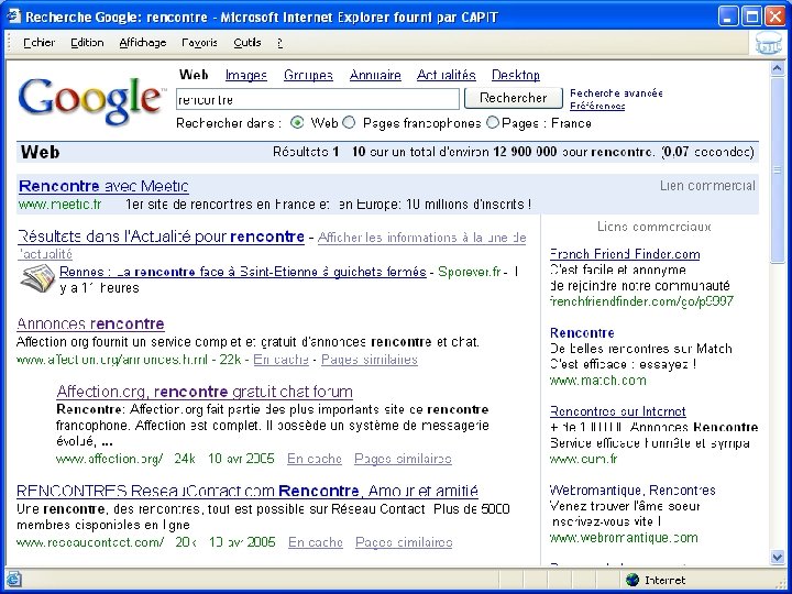 Conseils pour améliorer son positionnement • • Pas de Frames Pas de Flash. La page racine est la plus importante Ne pas utiliser de paramètres (URL rewriting) • http: //monsite. com/forum. asp? id=23 • => http: //monsite. com/forum/23. html • Mot clé dans l’url • Augmenter son IPP (Indice popularité des pages) • Pages avec nombre de mots conséquents • Sites avec grand nombre de pages