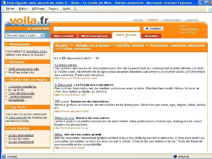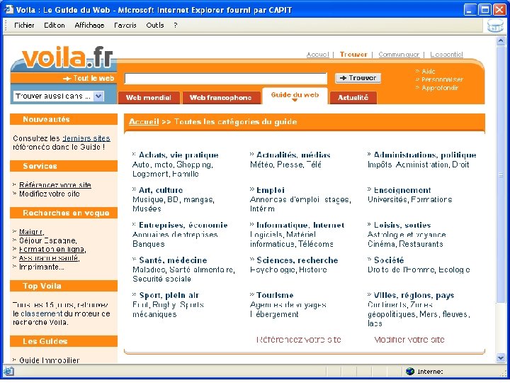 Les moteurs de recherche • Des araignées (spider ou crawler) suivent la toile. • Construction index. • La recherche par mot clé se fait sur l’Index du moteur. • Ordre de pertinence spécifique par moteur.