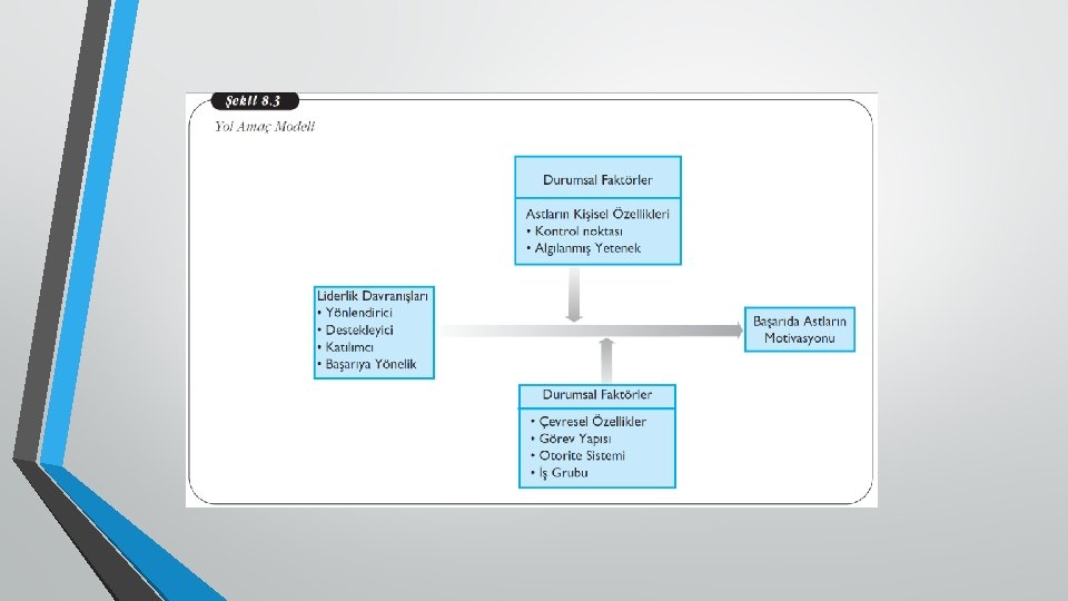 YOL-AMAÇ MODELİ • Liderlikte yol amaç modeli, liderin belirli özelliklerinden çok, liderlik davranışları ve durumları üzerinde durur. Bu model, güdülemedeki beklenti modelinin bir uzantısı sayılabilir. Yol-amaç teorisi, liderin içinde bulunduğu duruma uyumunu belirlemeye çalışır.