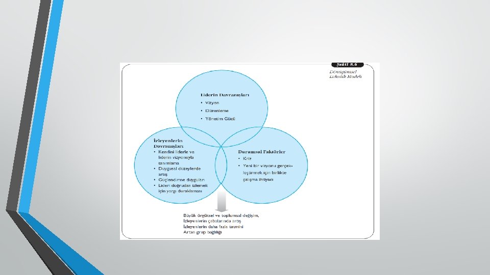 • Dönüşümsel liderler, kendilerini izleyenleri etkilemek ve bu tür bir sonuç almak için vizyon, düzenleme ve yönetim gücü olmak üzere üç tür davranış sergilerler. • Dönüşümsel lider, izleyenlerin örgüte istekli olarak katkıda bulunmaları için teşvik edici şartlar oluşturan bir model ve bir öğretmen olarak davranır.