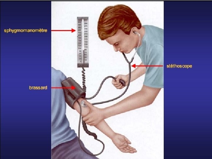 • Un brassard de taille adapté est placé à la partie moyenne du bras. • Relié à une poire (gonfler le brassard) et à un manomètre de contrôle. • On gonfle le brassard jusqu'à une pression > PA systolique : il n’ y a pas d’écoulement sanguin • Le brassard est dégonflé progressivement Lorsque la pression du brassard devient juste inférieure à la PA systolique, l’artère s’ouvre légèrement avec un flux turbulent et intermittent et qui engendre des vibrations que l’on perçoit par le stéthoscope (bruit de Korotkoff). • La pression à laquelle on entend le premier bruit est la PA systolique.