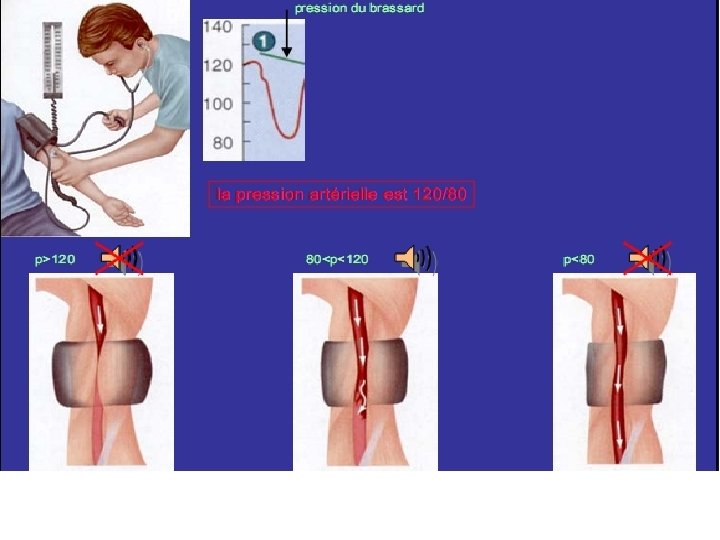 • Quand on dégonfle d’avantage, le sang s’écoule dans le brassard pour une durée de plus en plus grande à chaque cycle • Quand la pression du brassard devient inférieure à la PAD : l’artère est ouverte et le flux devient laminaire : disparition des bruits • Les bruits que l’on perçoit quand on mesure la PA ne sont pas les bruits du cœur, mais les vibrations produites par l’écoulement du sang turbulent dans l’artère partiellement comprimée